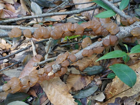 このキノコは乾燥している時はペタッとしているが、雨が降った後は水分を含んで膨らみ、この写真のようにプルプルになるところがかわいい。