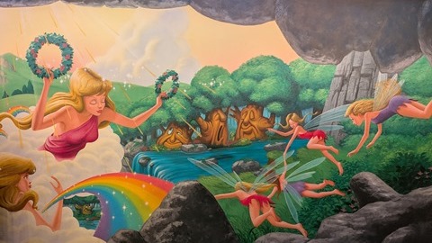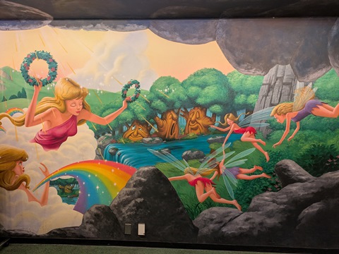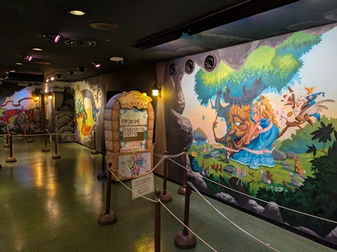 フェアリーランドシアター前に到着してからピューロパスの案内が始まるまで5分ほどあったので、周りの壁に描かれている絵をスマホのカメラで撮影してみた。