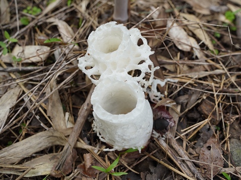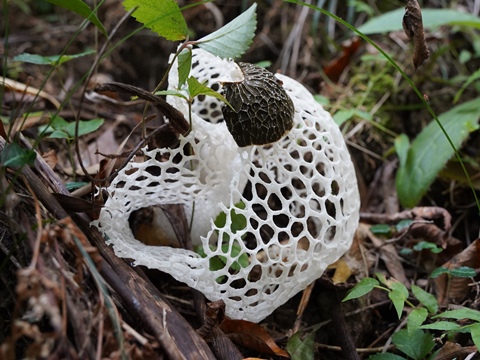 戻るにはまだ早い時間だったので、いつものポイントよりも少し上の方まで行ってみると、キヌガサタケ発見。