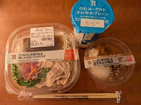ホテルの近くのコンビニで夕食を買い、客室の中で食べた。
