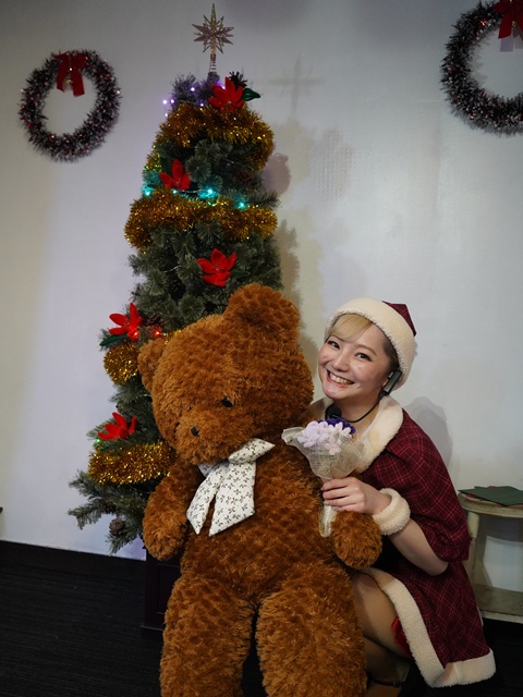 会場に置いてあった熊のぬいぐるみを抱いた写真を撮らせてもらった。