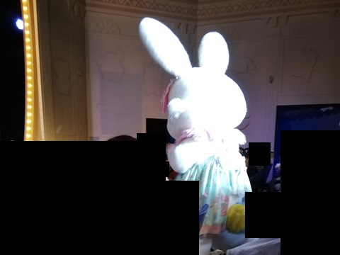 デジカメで動画を撮ろうとしたが、ステージの照明のせいかメルちゃんに明るさが上手く合わなかったので、スマホで写真を撮った。