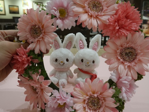 とりあえず、花の輪っかが二つ置かれているテーブルでぬい撮りを始めてみた。